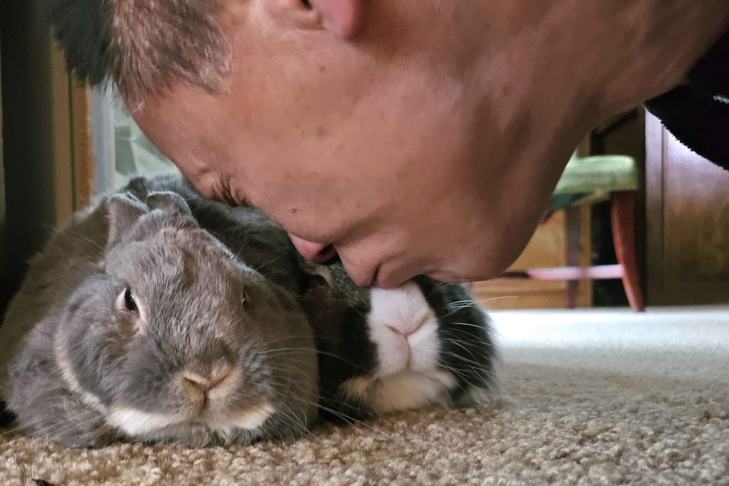 As he gently stroked their heads, he said softly, “Enzo, you’re such a handsome boy. You have such a big heart and kind soul. You’re my unicorn bunny. Merlot, you’re such a pretty girl. You take such good care of Enzo. I’m so lucky to have you guys.”