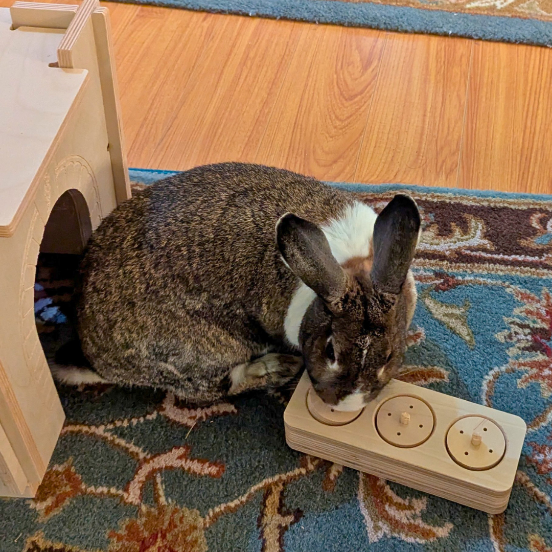 A sweet yet sassy free-roam bun who loves midday naps & showing off binkies with his partner, Peaches. When he’s not playing with toys, he’s happily munching his favorite hay & treats.