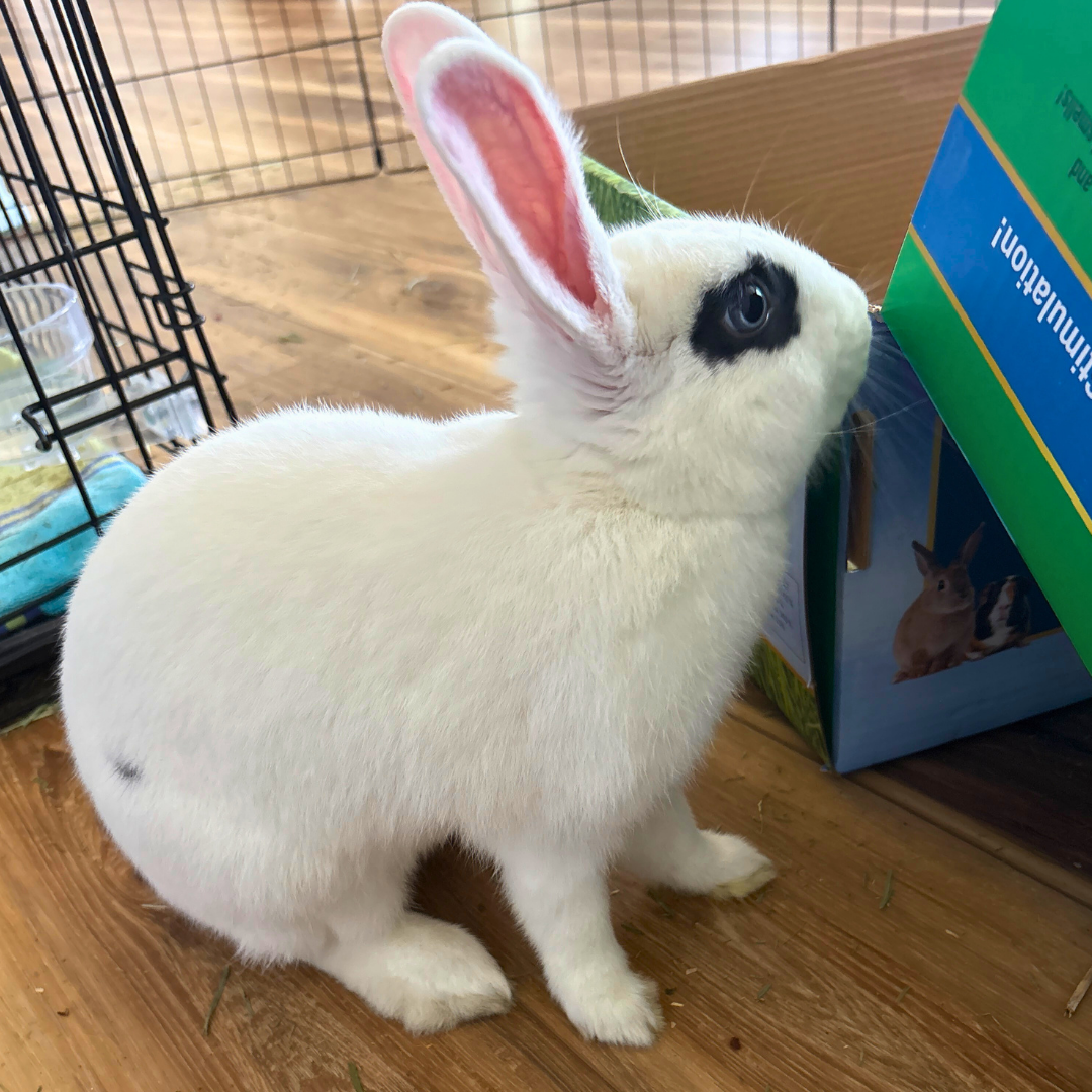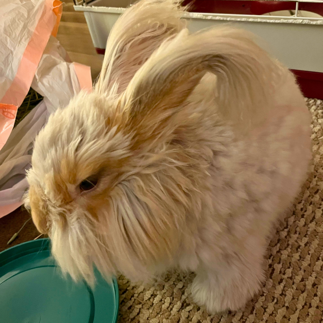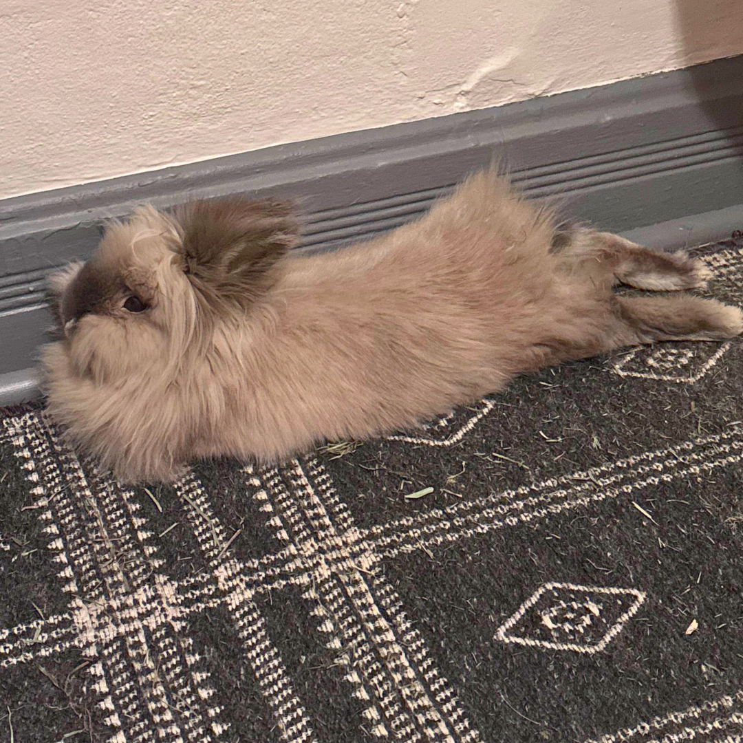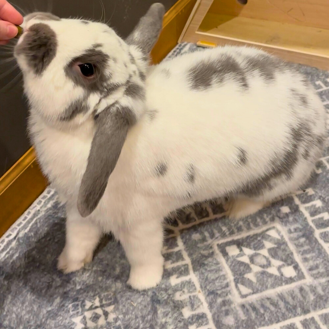 Demands a treat the moment you enter the room. Her favorite treats are banana & blueberries, which she’ll shamelessly snatch. Despite the sass, she’s very sweet and will bow her head for pets. Small Pet Select orchard hay is her go-to. 🐰