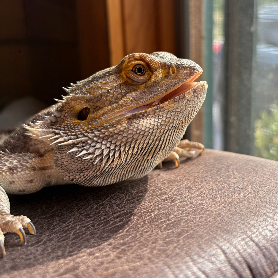 This bearded dragon is a true adventurer who loves exploring the house under close supervision. When he’s not on the move, he's often found gazing out the window, watching birds & squirrels go by. ✨