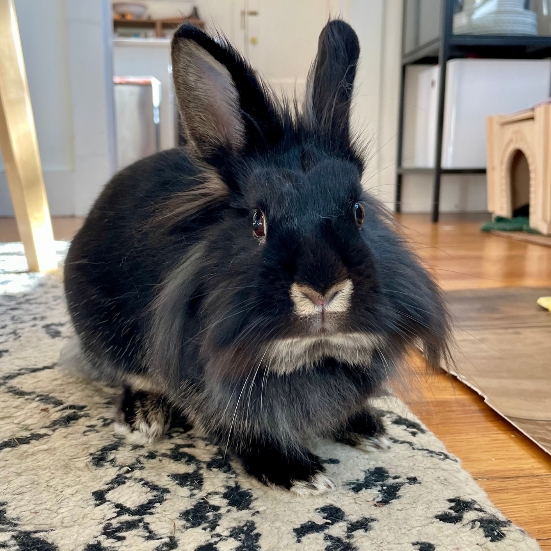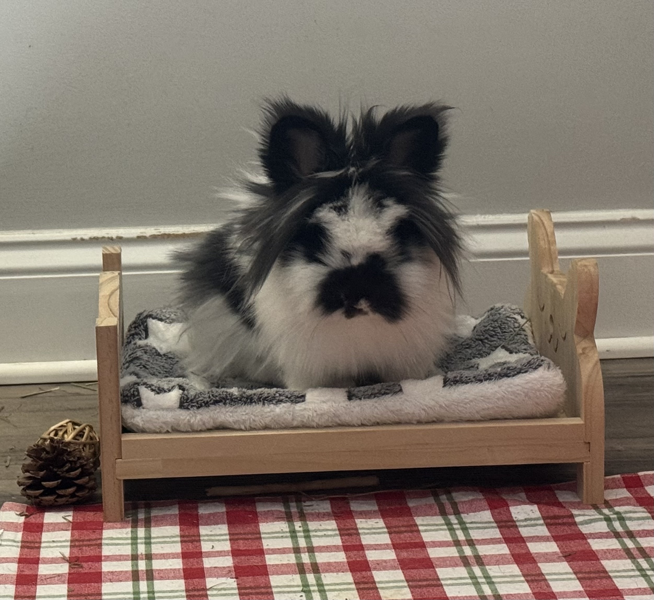The ultimate bunmate who runs a strict breakfast routine, supervises hay refills, & always “wins” couch digging games. After treats & cuddles, he guards the door & naps to soothing flute music. 💕