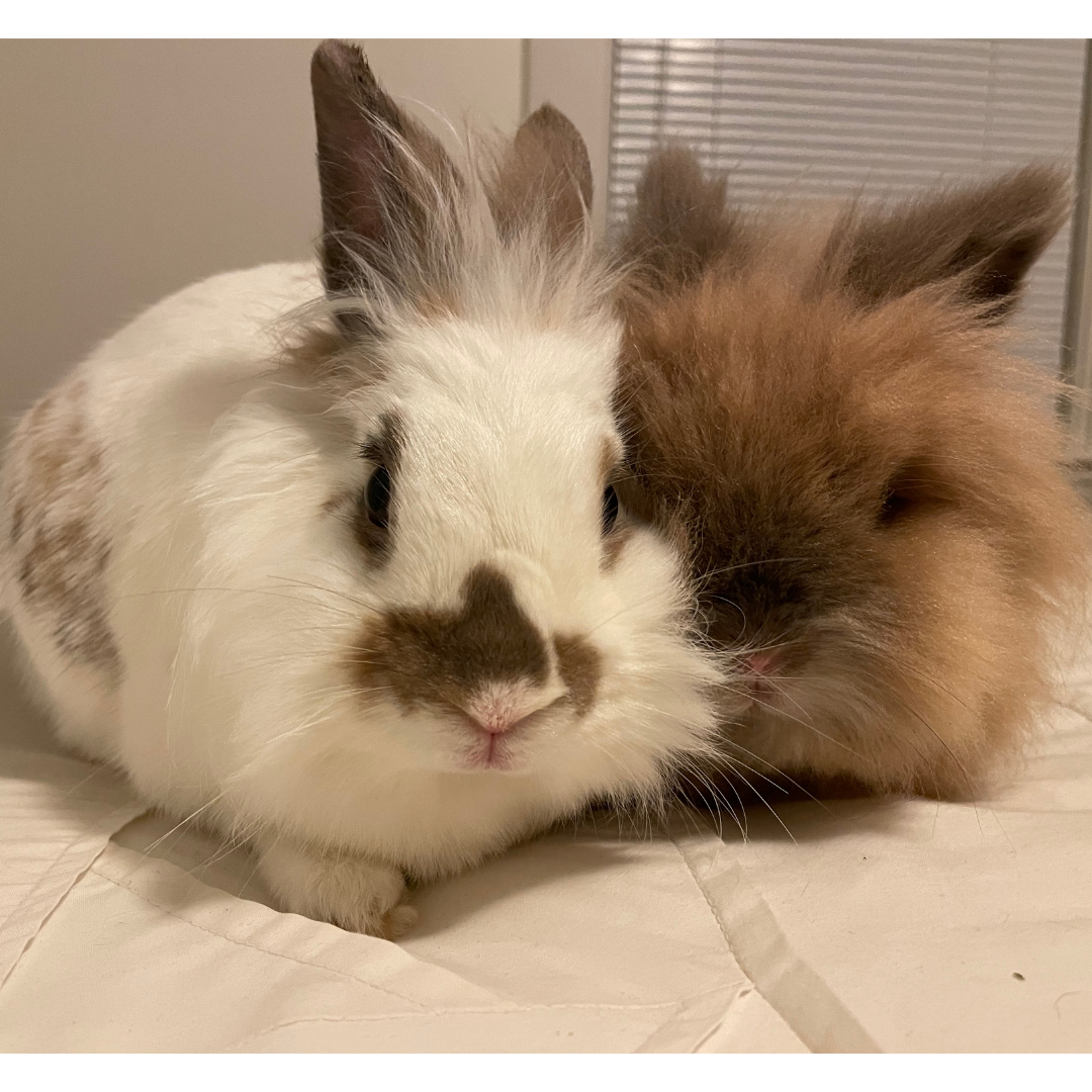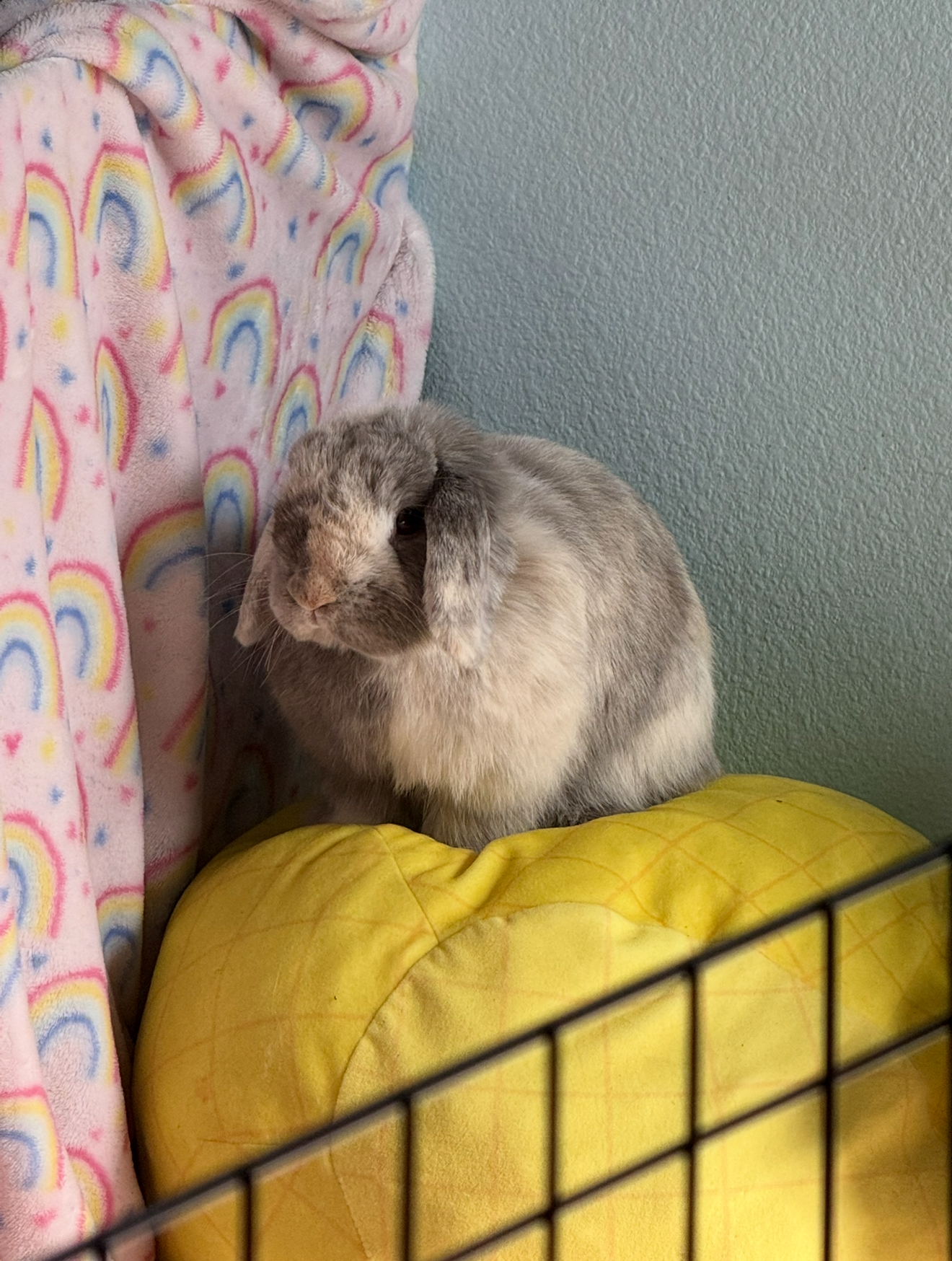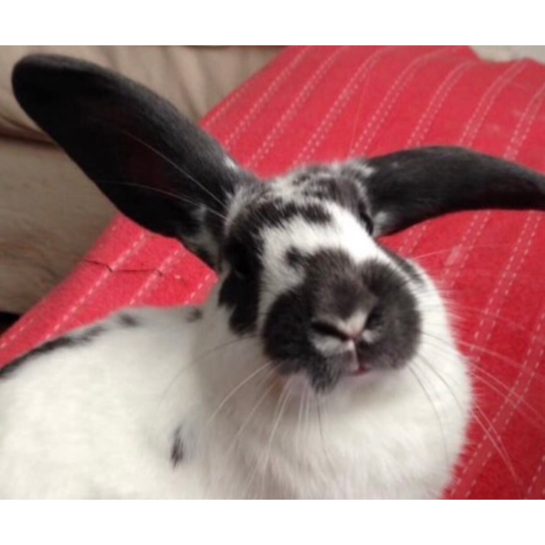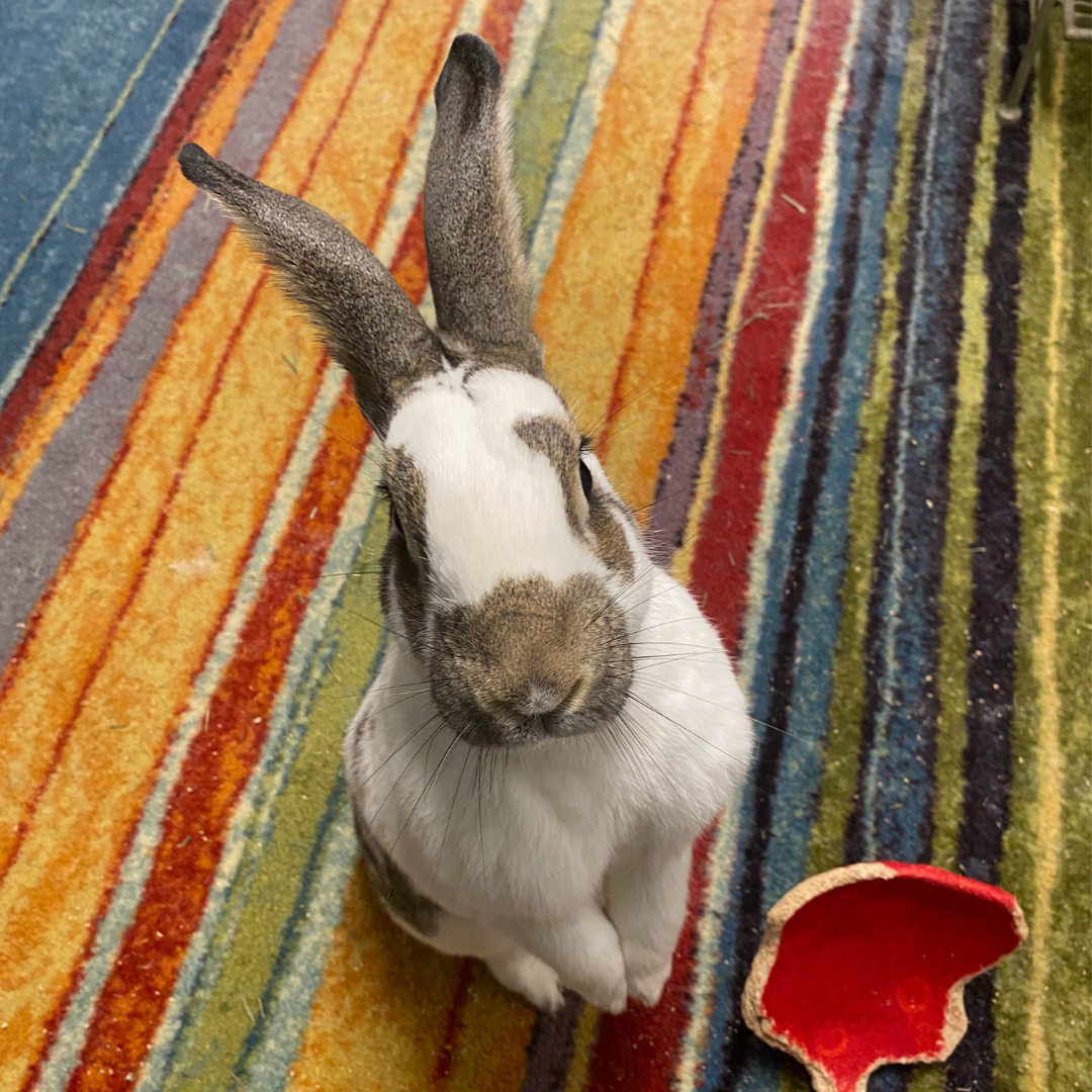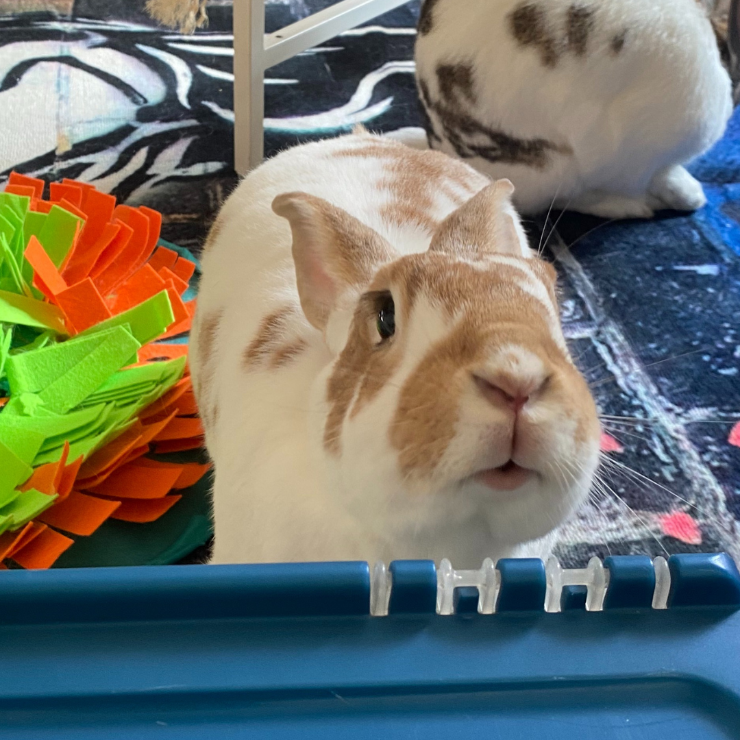 This silly little guy spends his days licking random objects, digging in empty hay boxes, & doting on his bun wife, Speedy. At night, he snuggles by his hooman dad’s chair while waiting for pats & bedtime rabbit chews.🐾