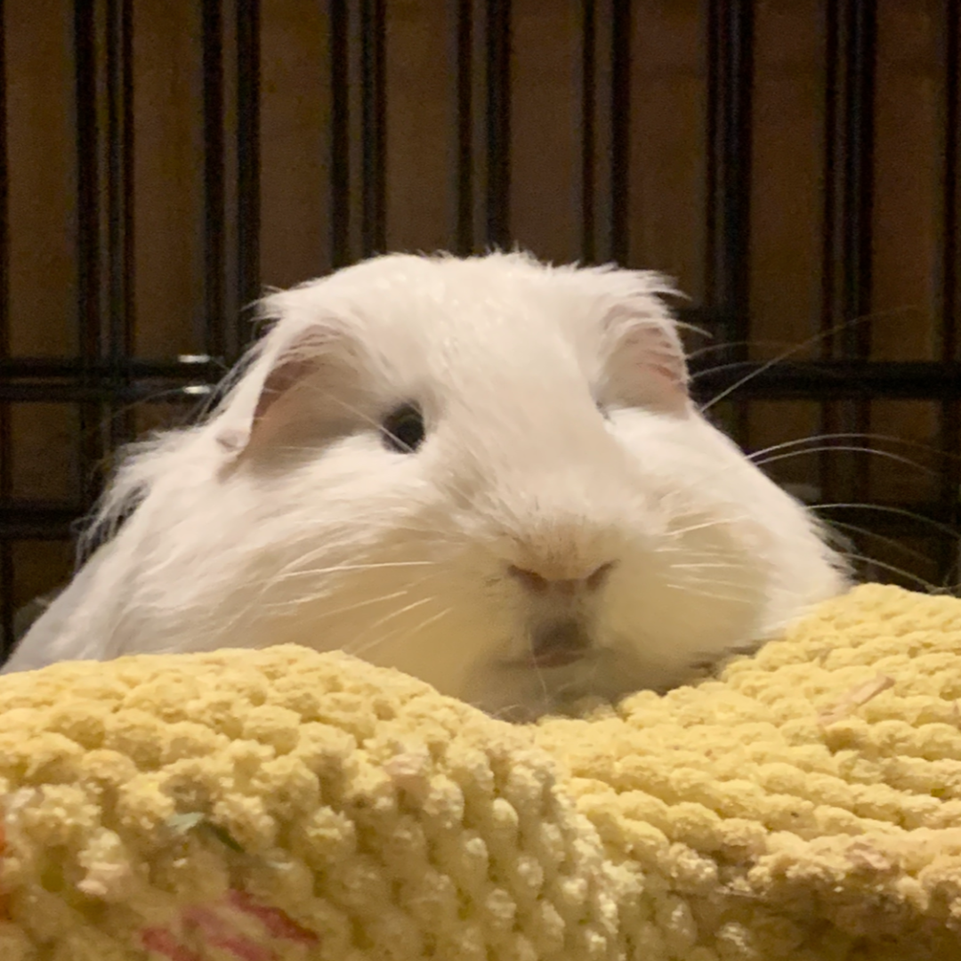 A very good boy who melts into yawning fits when he gets pets & happily chirps & whistles at fresh hay time. He adores his brother Milo; the two are often caught playing hay tug-of-war. 🐹