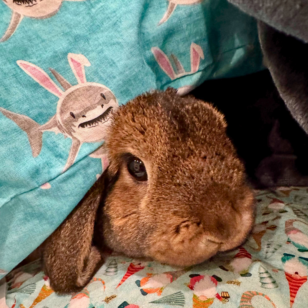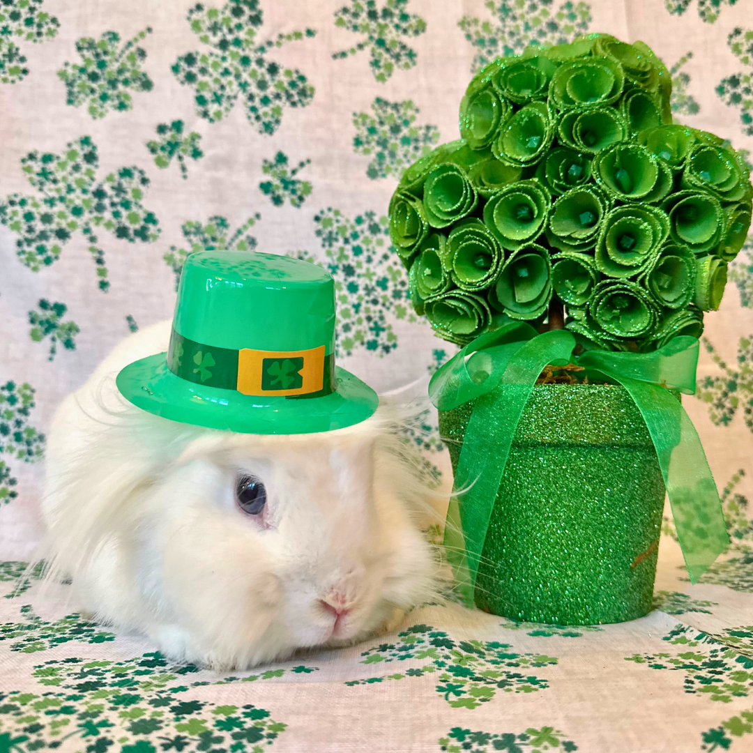10-year-old rescue, she’s got a killer RBF (resting bun face), endless rabbitude, & the confidence to ignore treats. But when grandmom comes by with pets, this little leprechaun melts. She's her hoomans lucky charm, heart, & happiness.